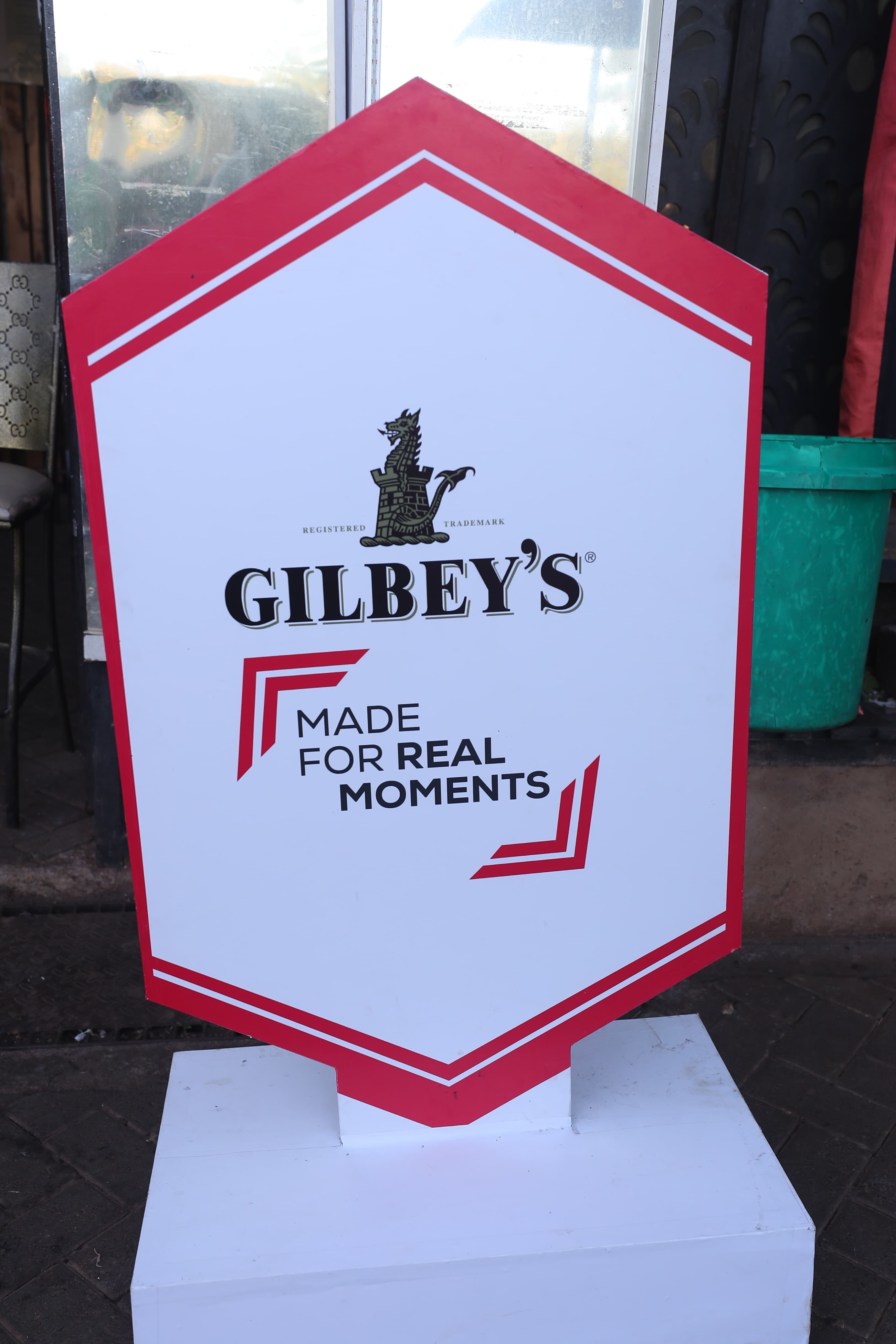 It proudly displayed the trademarked Gilbey's castle logo above the campaign slogan: "Made For Real Moments," flanked by red chevron arrows.